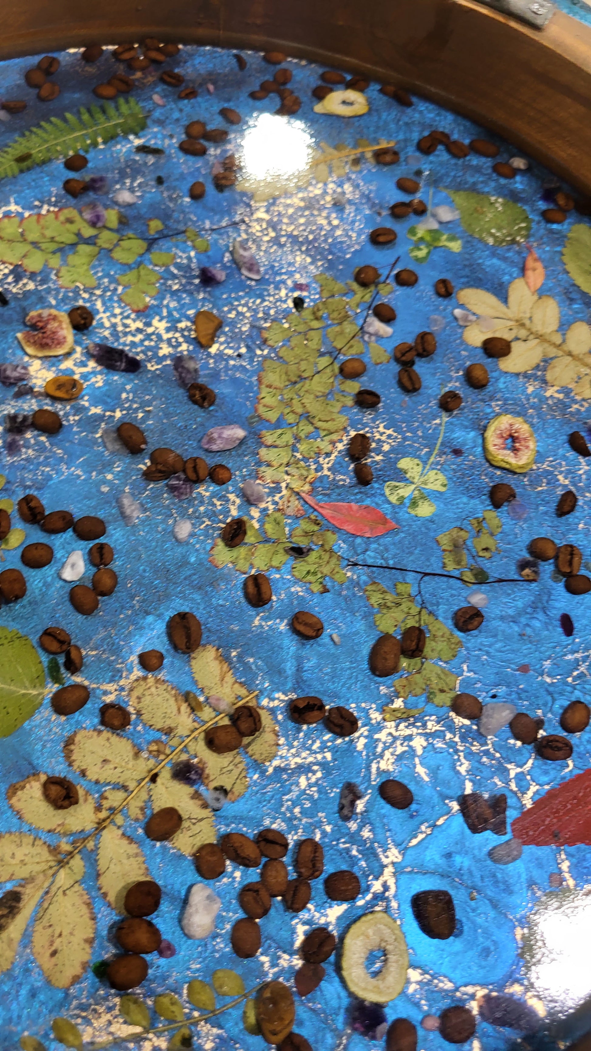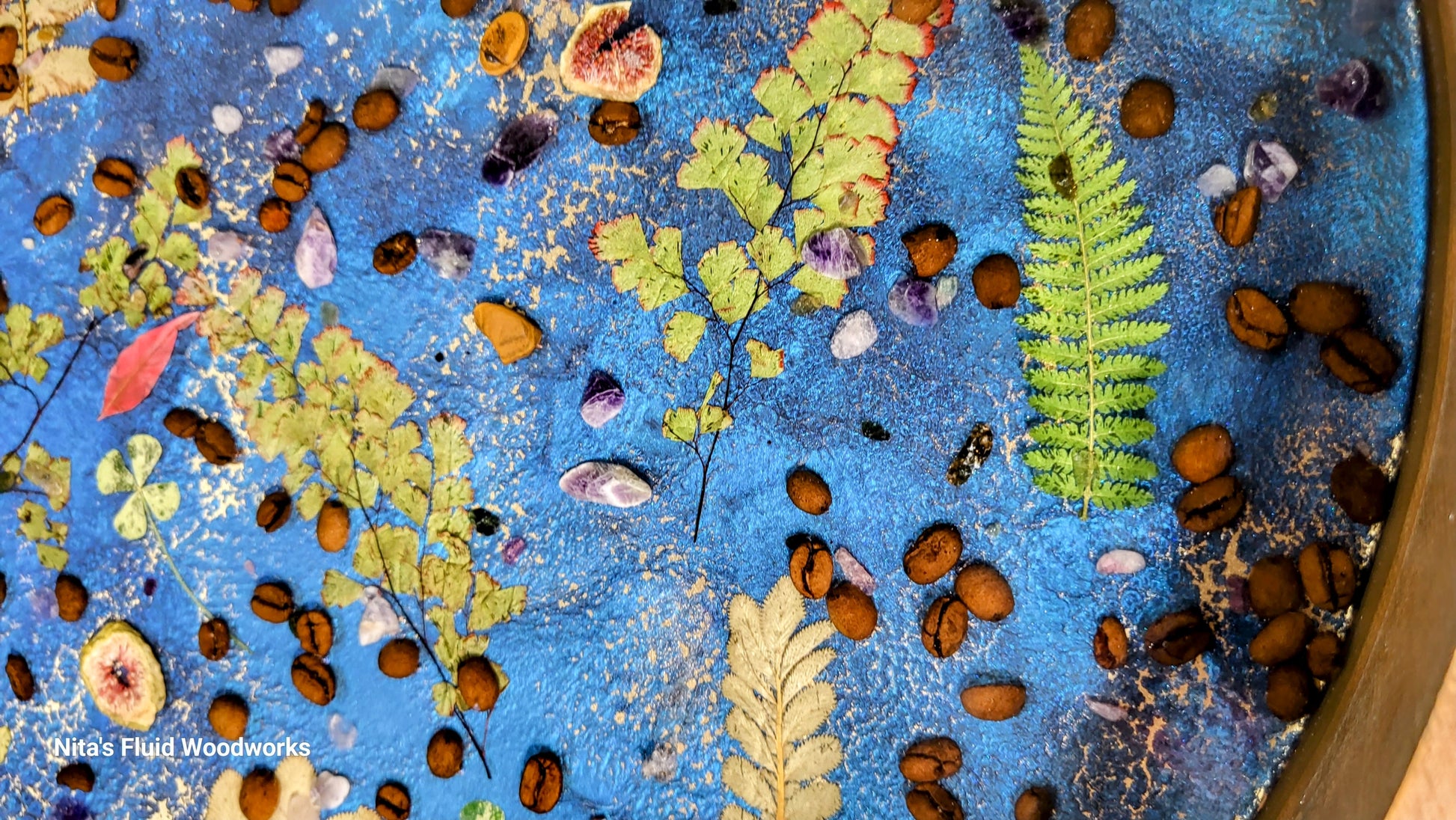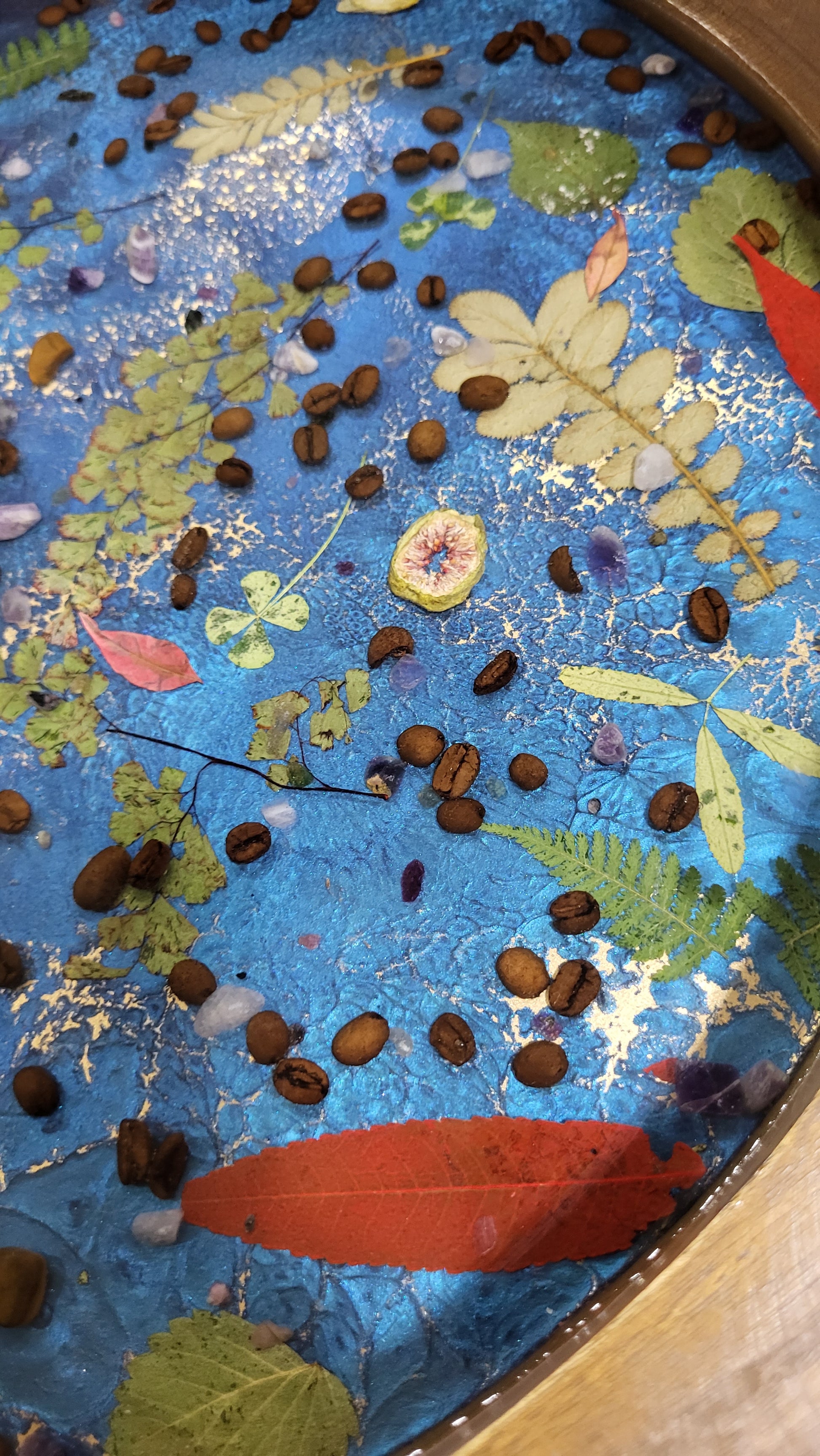 Add your own flowers and botanicals, to create a stunning display tray.  This tray was filled with Tigers eye, Amethysts, Coffee Beans, 4 leaf covers,  ferns,  rose quartz, and other botanicals. The tray is 17" in Diameter,  2.5" deep.