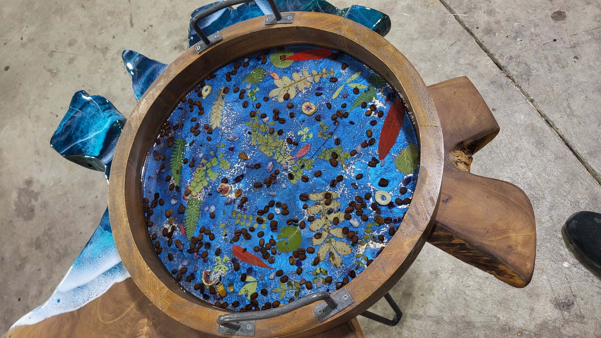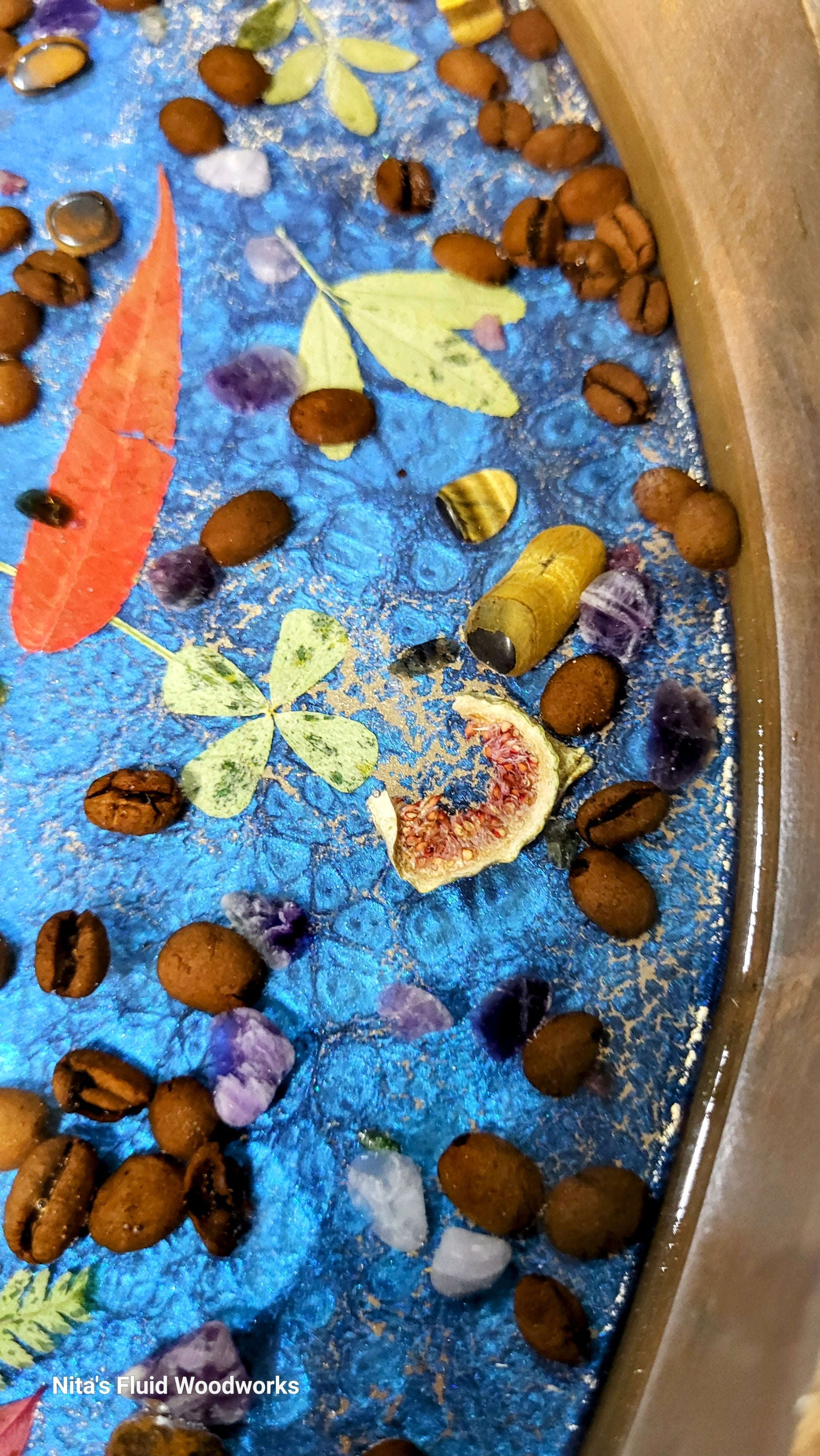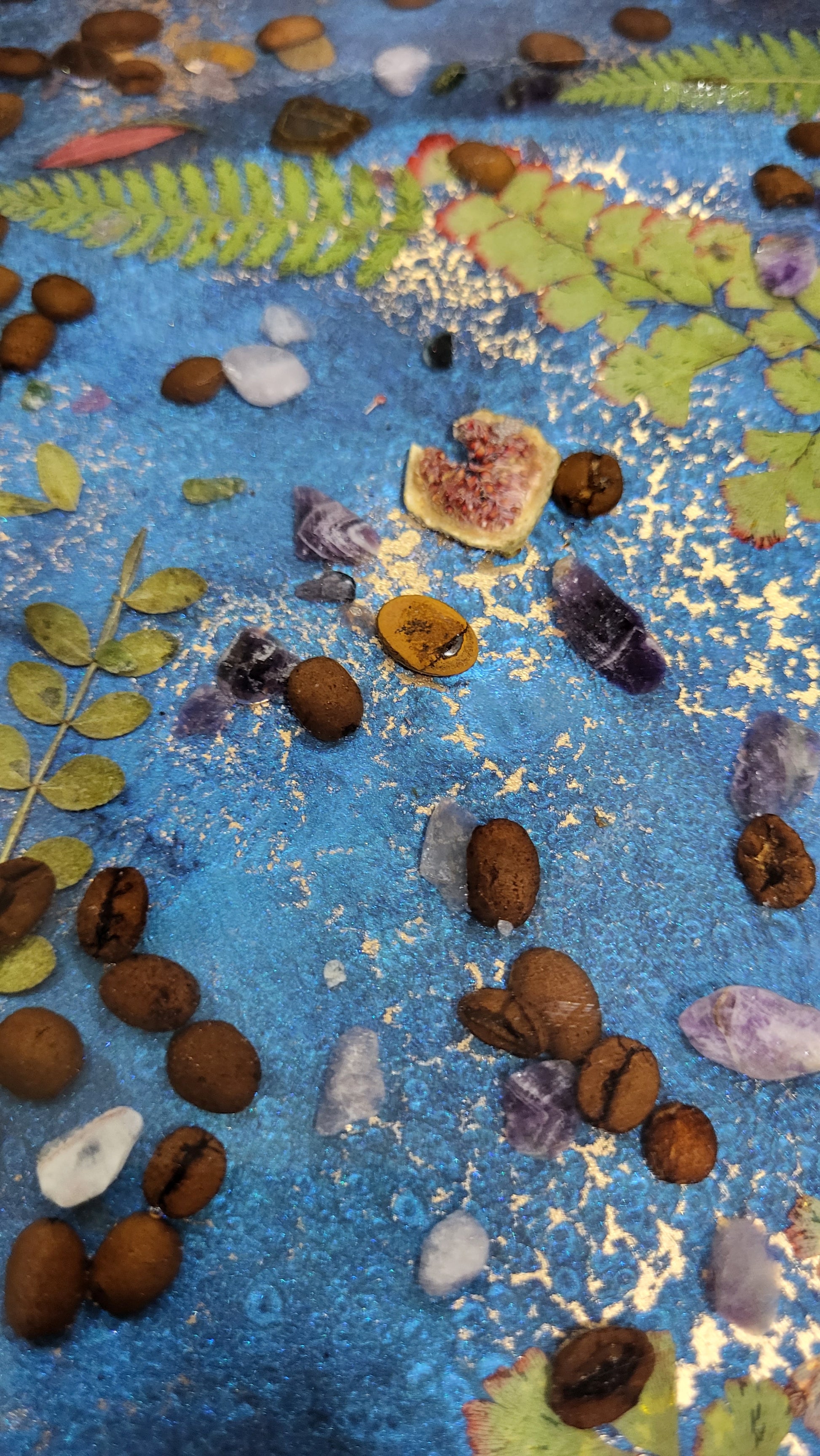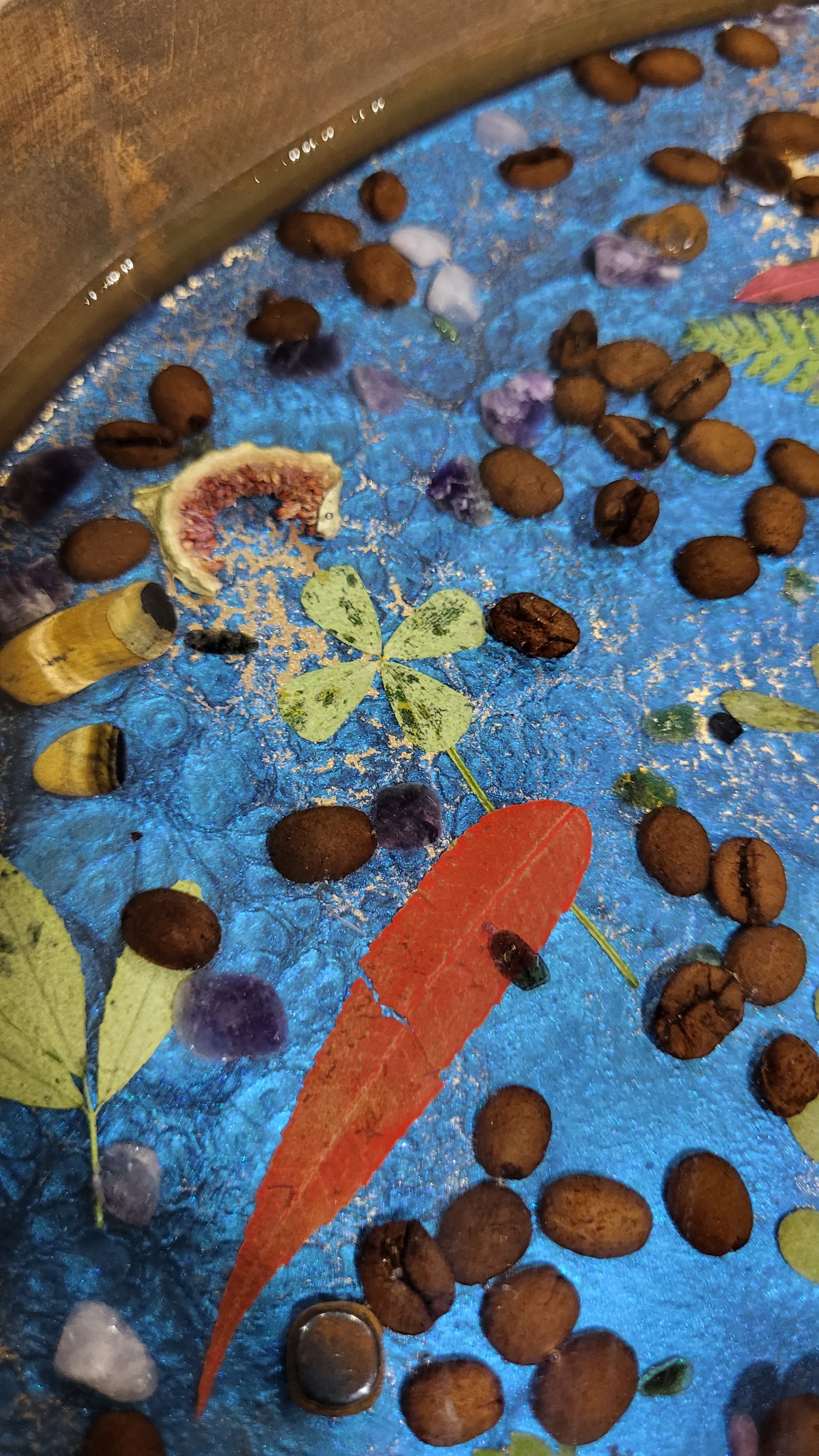 Add your own flowers and botanicals, to create a stunning display tray.  This tray was filled with Tigers eye, Amethysts, Coffee Beans, 4 leaf covers,  ferns,  rose quartz, and other botanicals. The tray is 17" in Diameter,  2.5" deep.