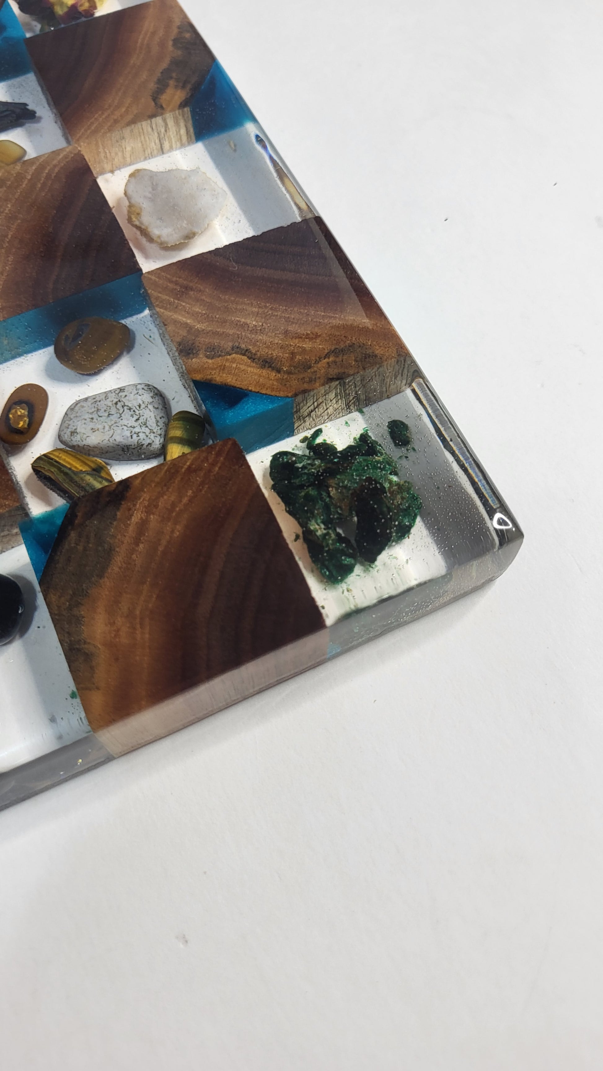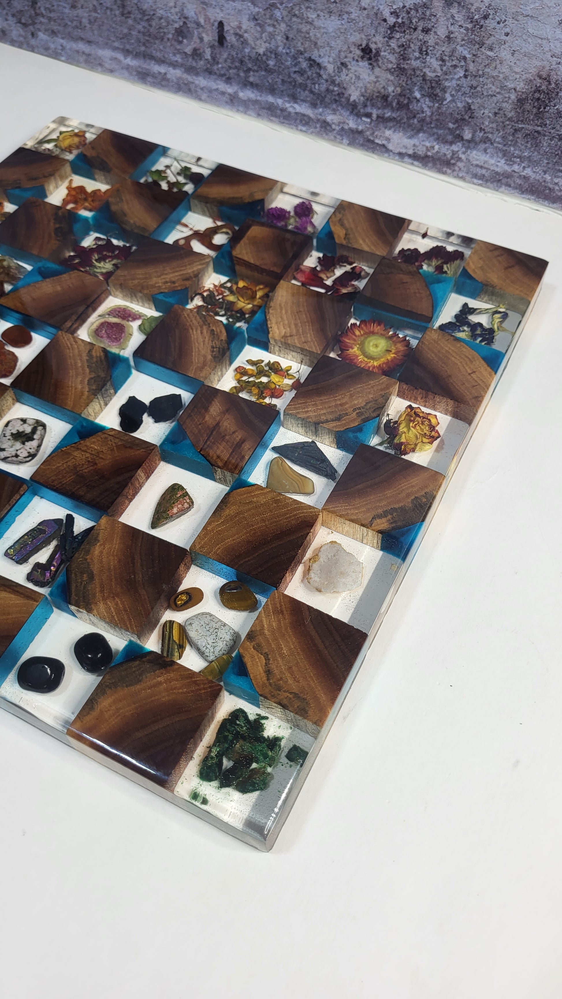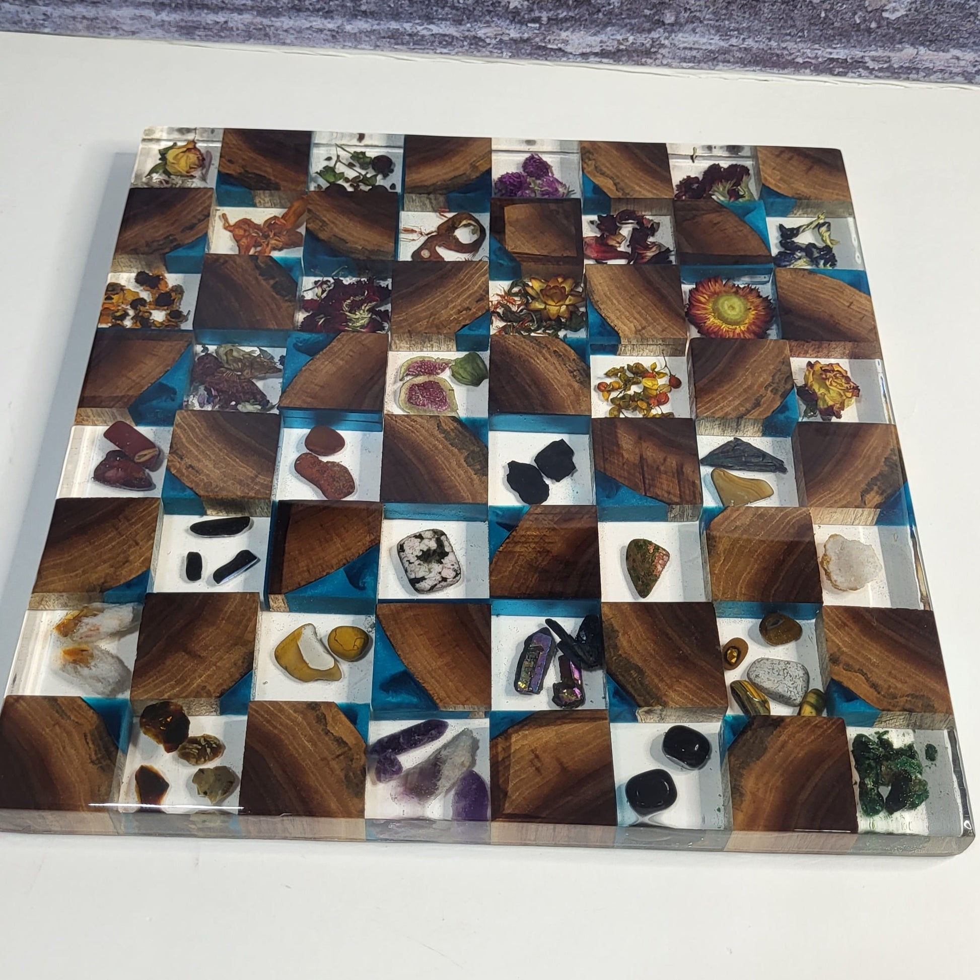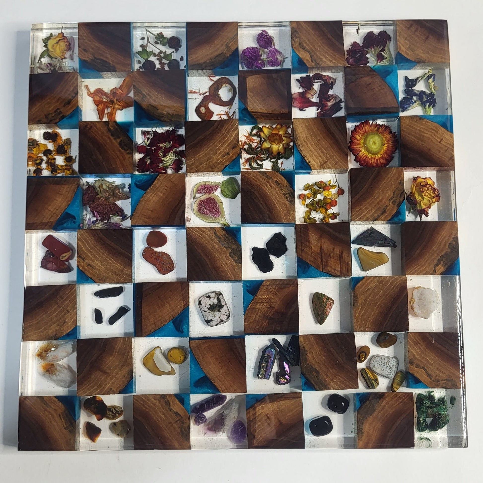 Epoxy resin Crystal and botanical Chess Board. She's Still being made! But you get to see the process! 14x14, black walnut and Okinawa Blue squares alternate to botanical against crystal and mineral squares! This chess board game can include Chess pieces, that match the side they go on. Order separately.
