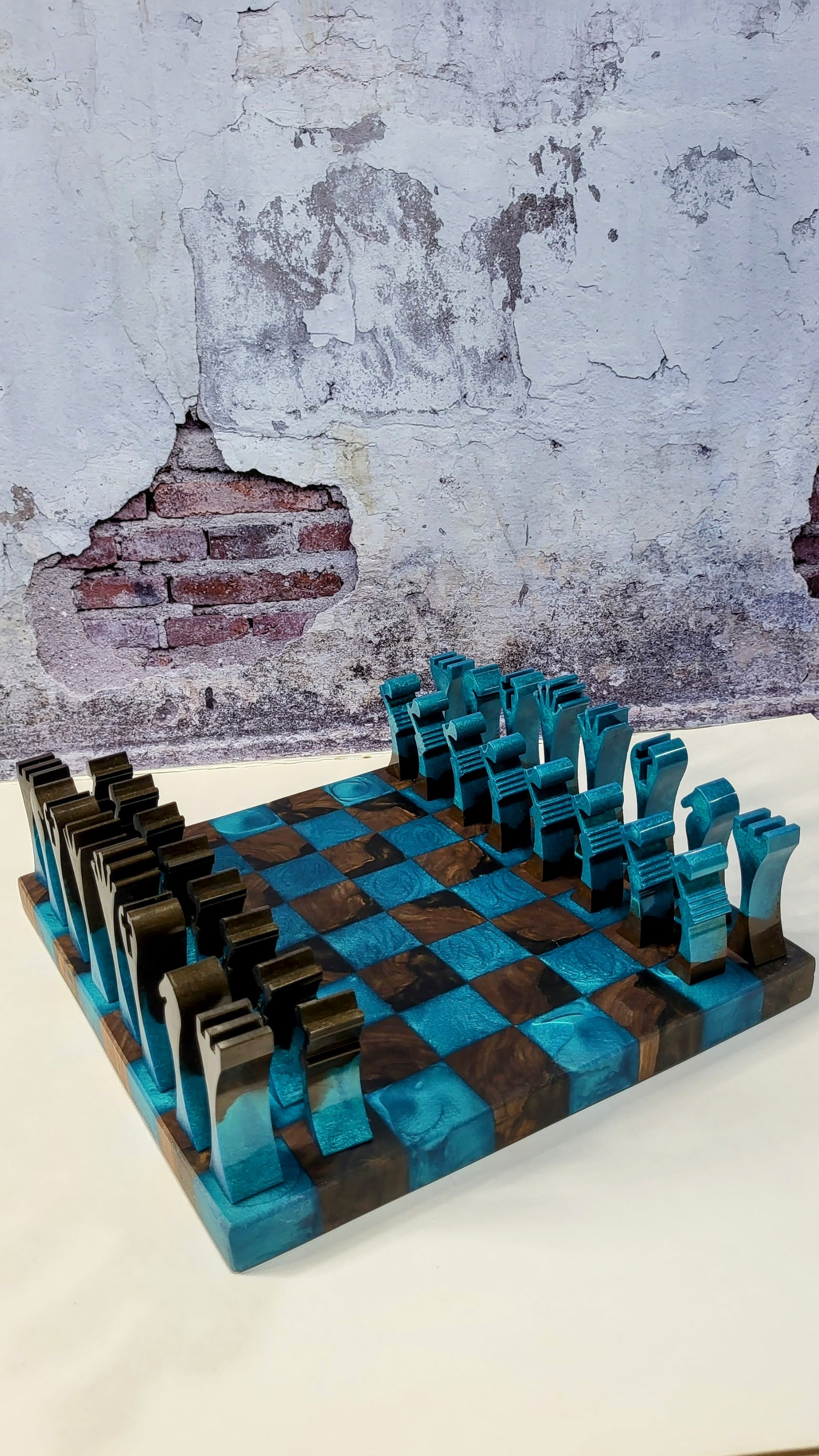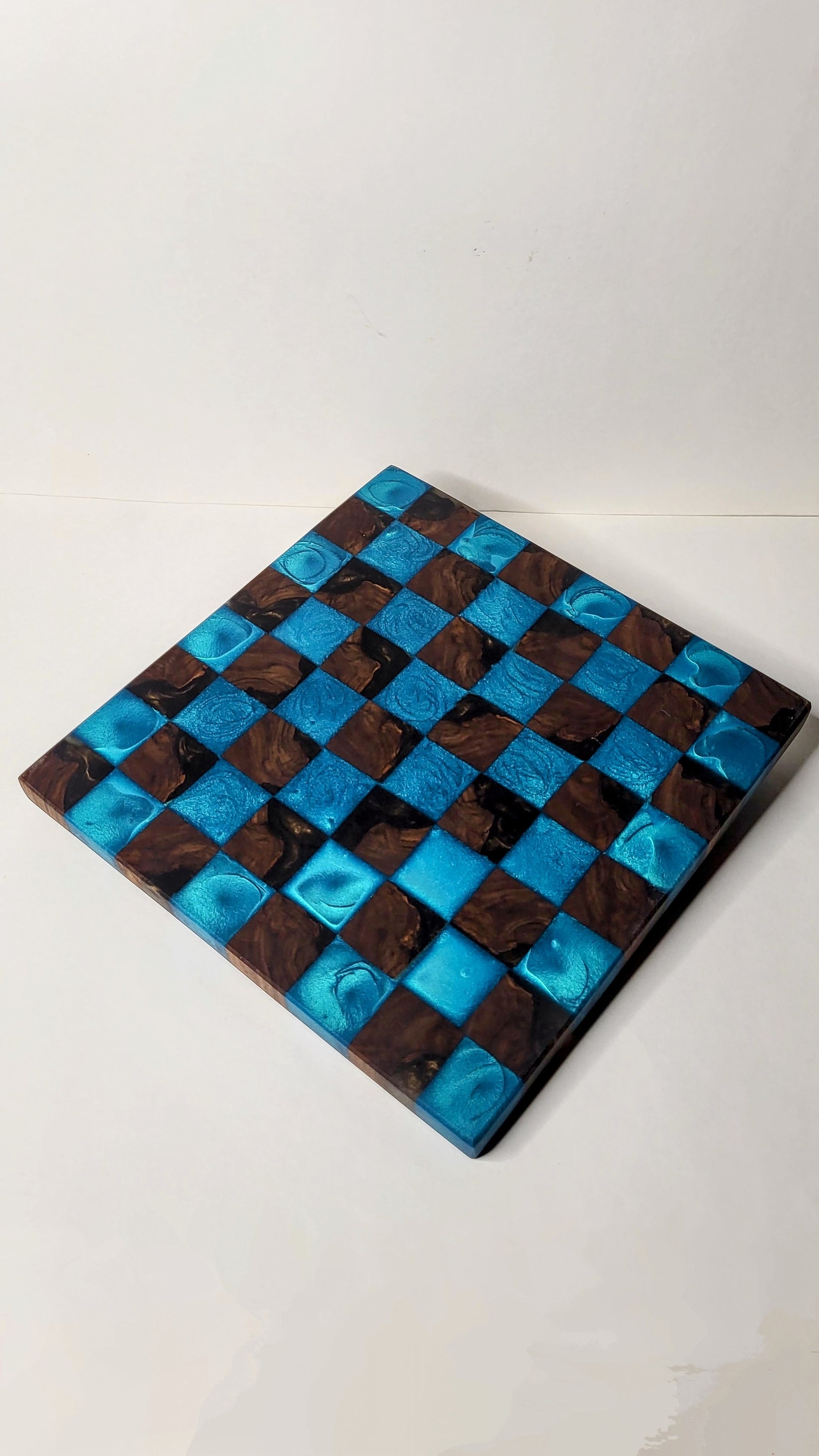 Chess board can be made custom. Please leave a note, choosing your color scheme. Down below there are color variations, if you'd like a different color, just message me. This specific Chess board made from Black Walnut and brown resin squares, and okinawa squares. Pieces are available! Dimensions - 12.75x12.75”