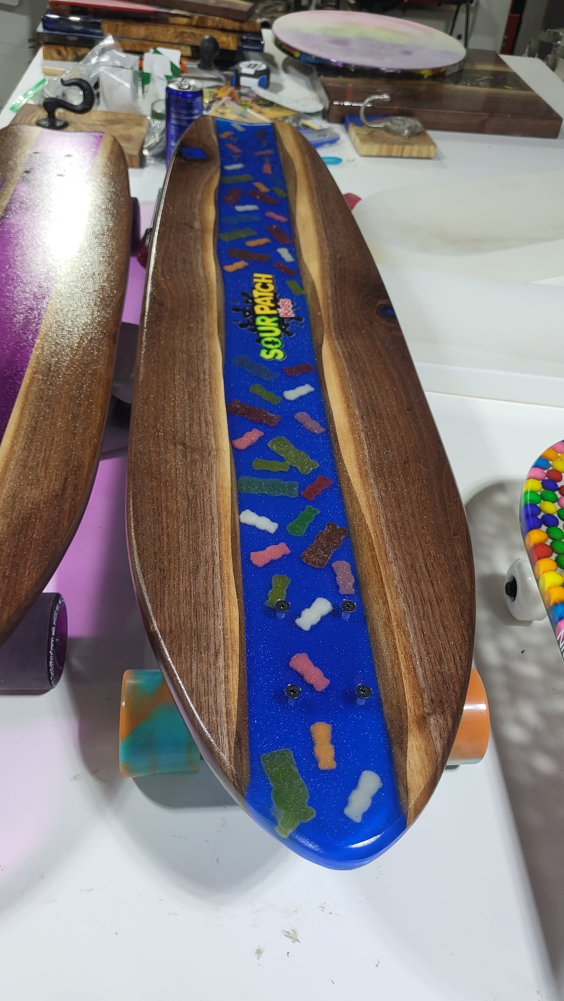 If you are looking for a more custom Epoxy River Longboard, we offer different epoxy resin colors and can add name(s), as well as ANY silhouette design, and more. If you want a different colored wheel, I got you! The sky's the limits, I work with you to make your dream board come to life. Custom orders are available upon request, so please contact us before placing your order. We can also use things from your own private collection as well to incorporate into the board! To see more of my work available currently, see Here.