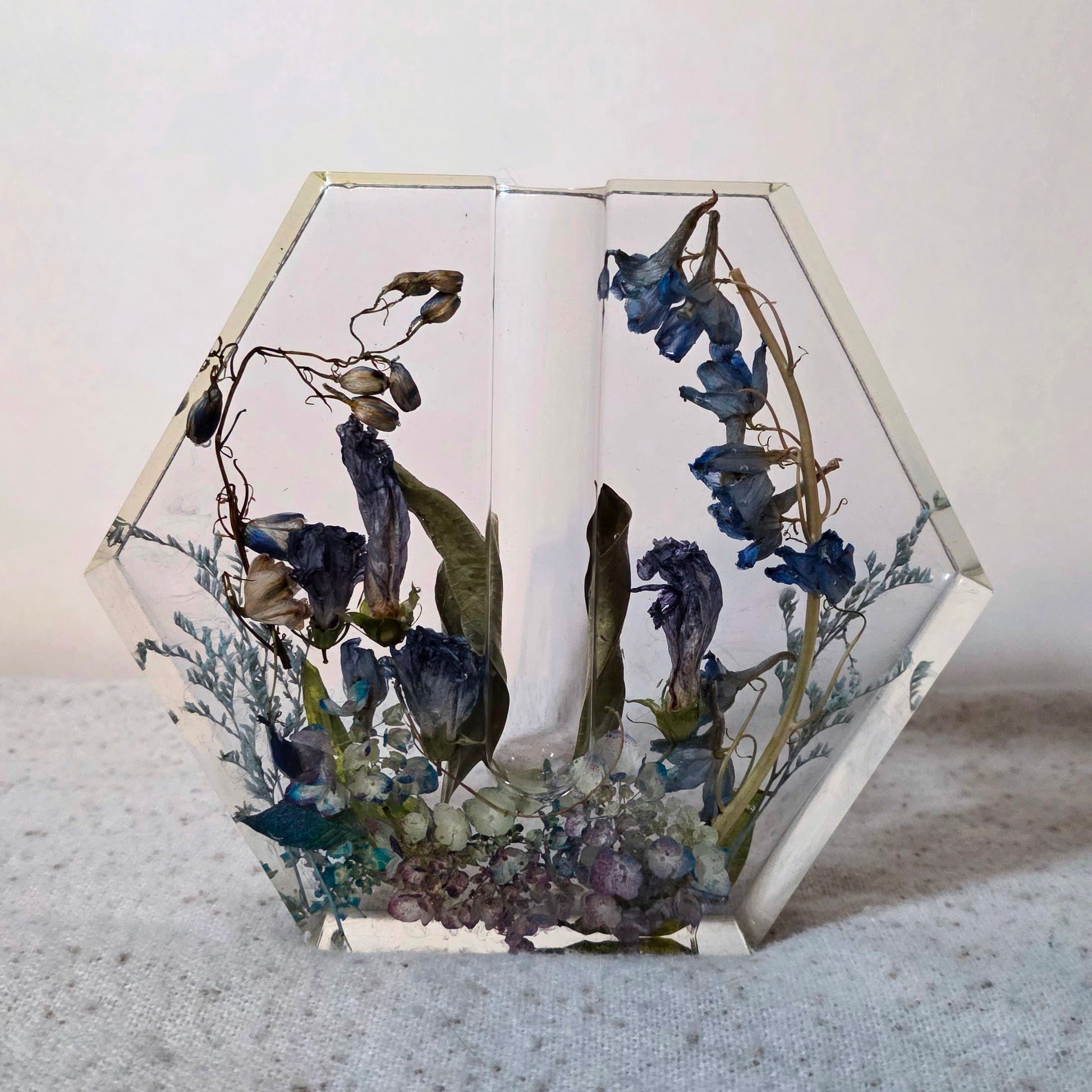 Your Real flowers are preserved in crystal-clear resin and suspended inside a faceted hex block with a built-in spot for your own propagation tube. Drop a cutting in water and watch it root through the center of the arrangement, framed by the preserved bouquet.
