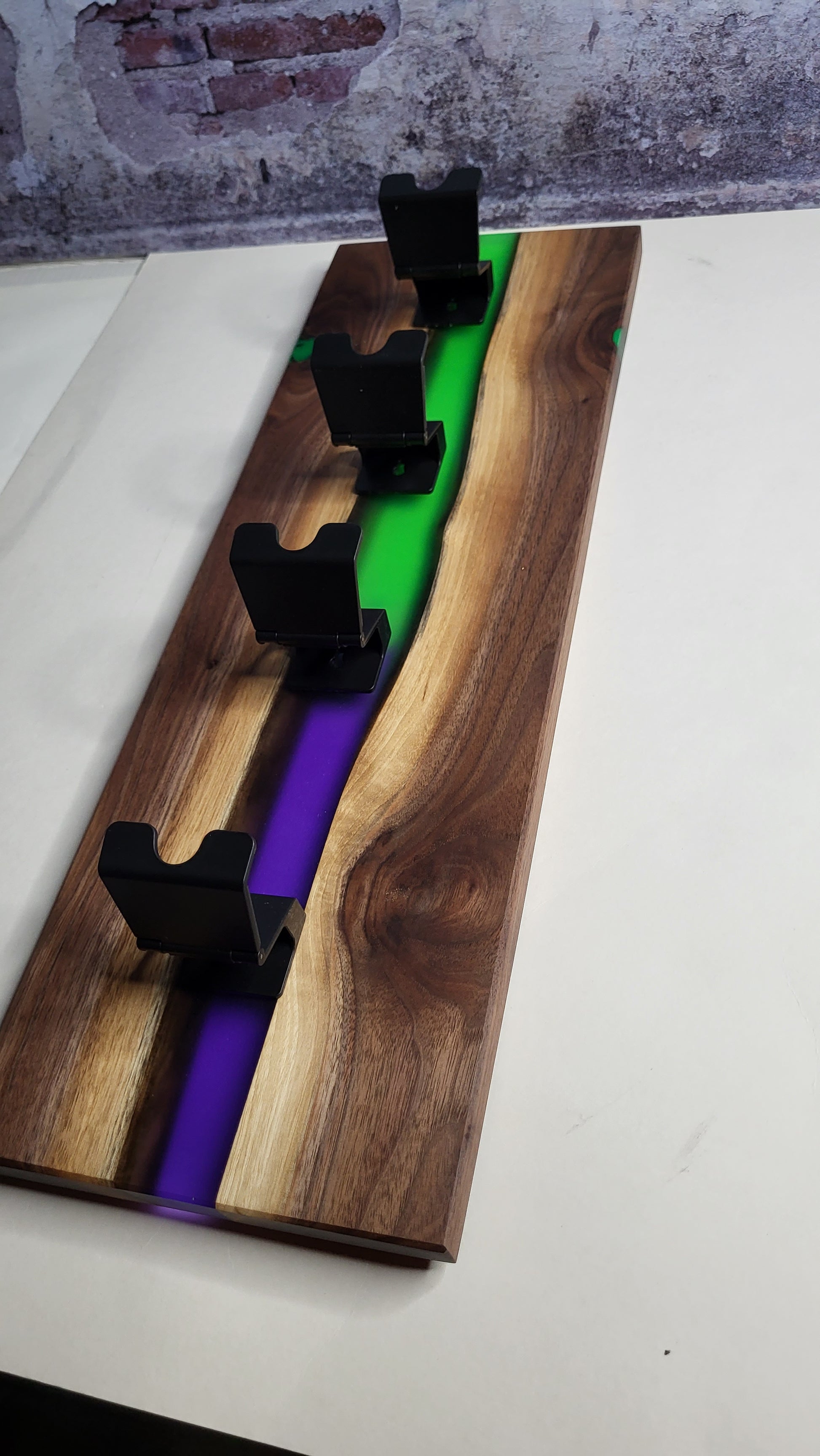 24x8 and 4 holders for your gaming controllers.  The hardware folds up when not in use.  Super sleek.  This specific one has sold. Each piece is handmade so it'll be a little different.  Choose your river color!