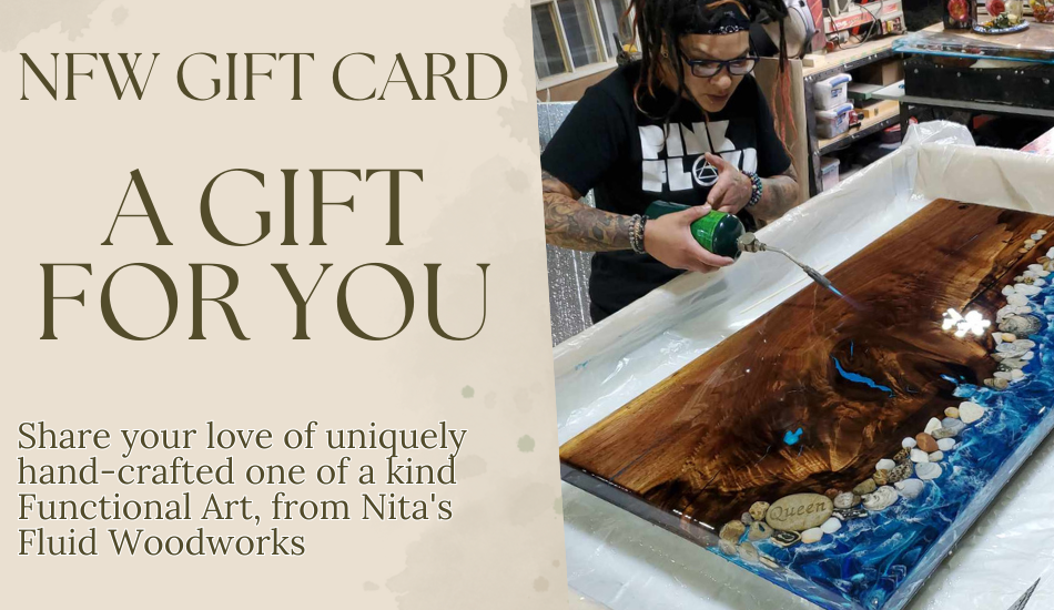 Do you know someone who shares your love and passion of uniquely hand-crafted home goods! Nitas fluid woodworks gift cards are the perfect gift for those who maybe you're not quiet sure what to get them this holiday season.....Let them learn a new skill for a lifetime with Nitas epoxy resin E-courses that will teach them the art of resin from the very best or let them pick out a one of a kind pre-made treasure from Nita's website or even better yet allow your special someone to work with Nita to customize a unique to them piece to treasure for a lifetime!!