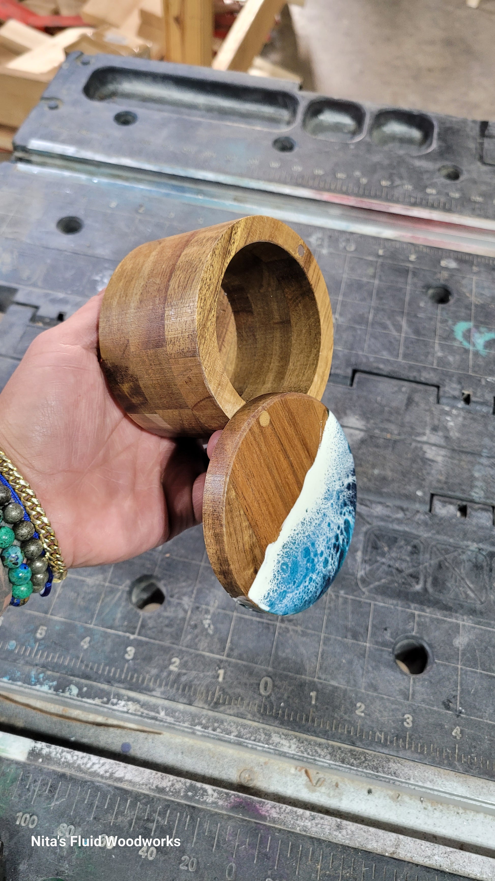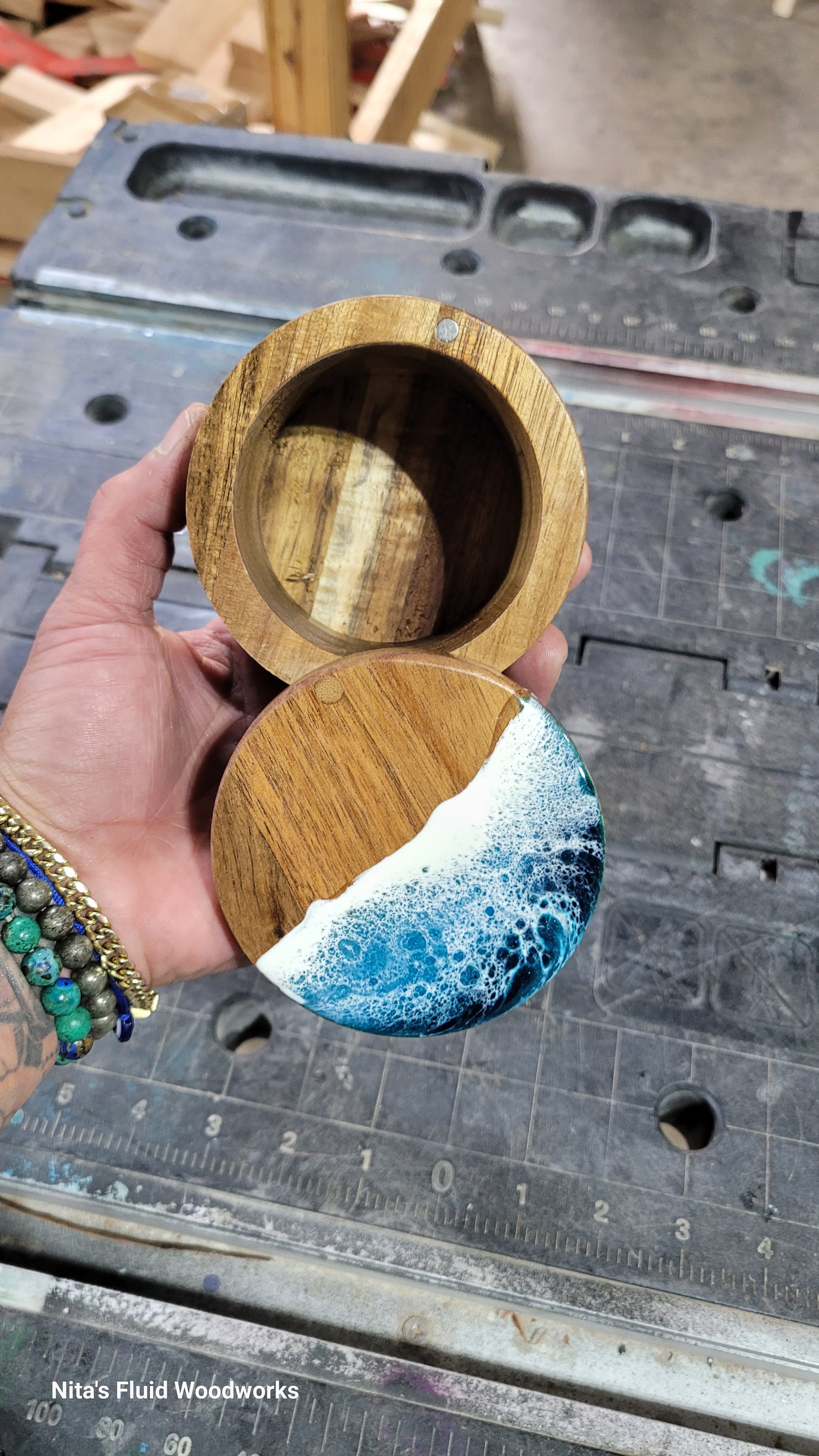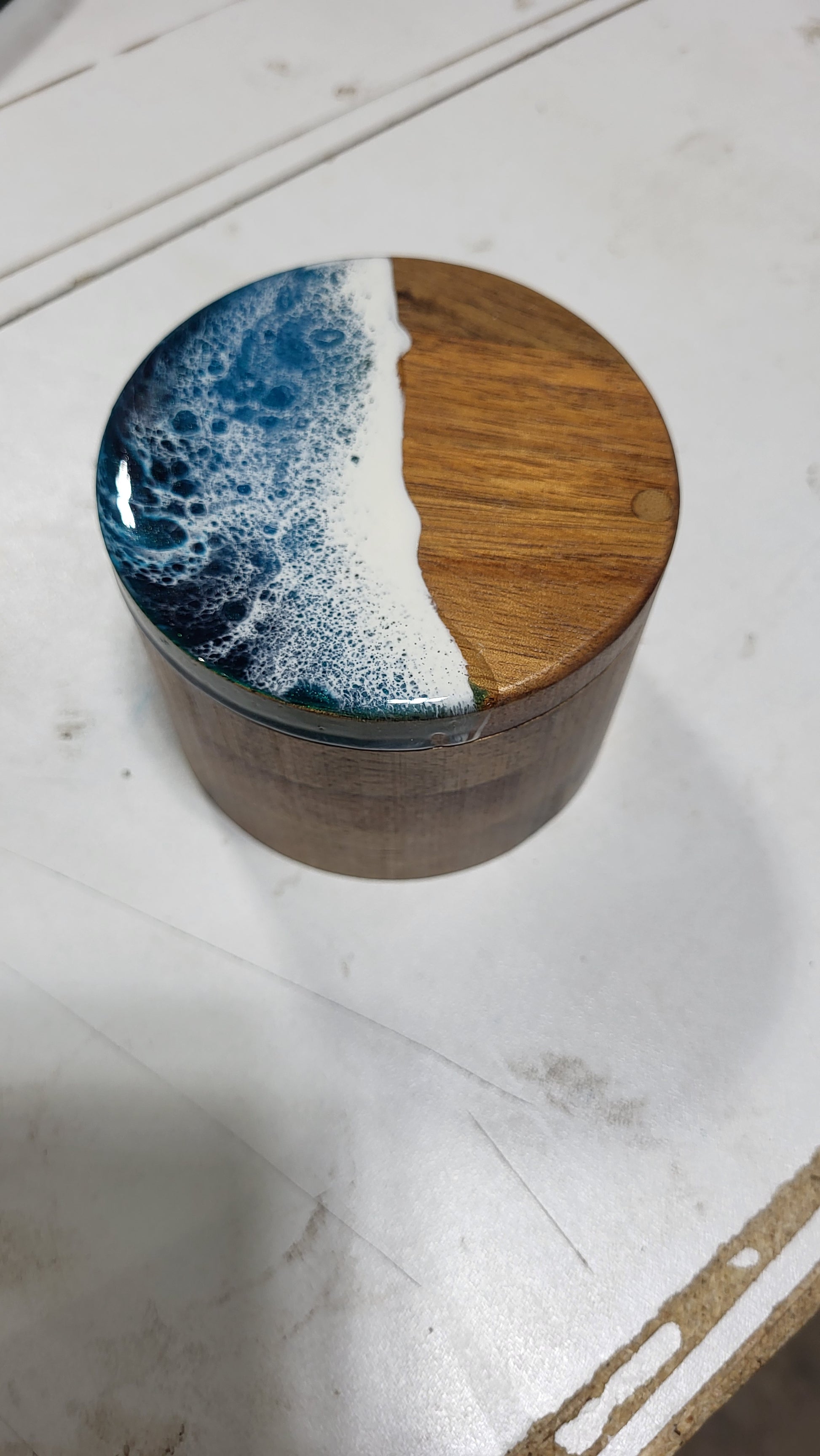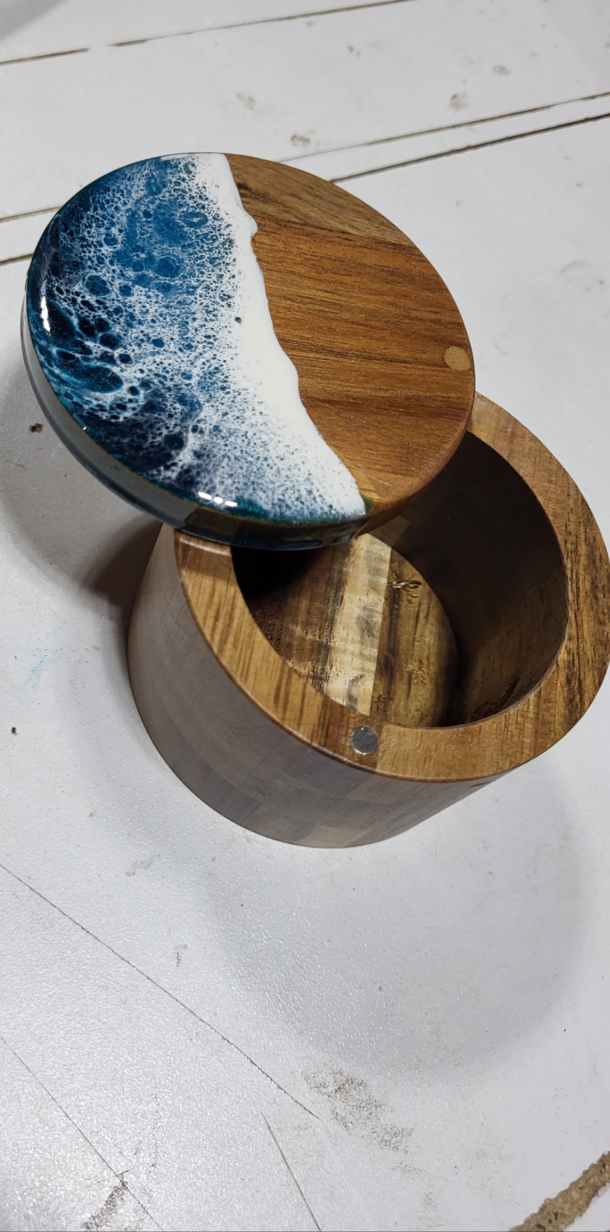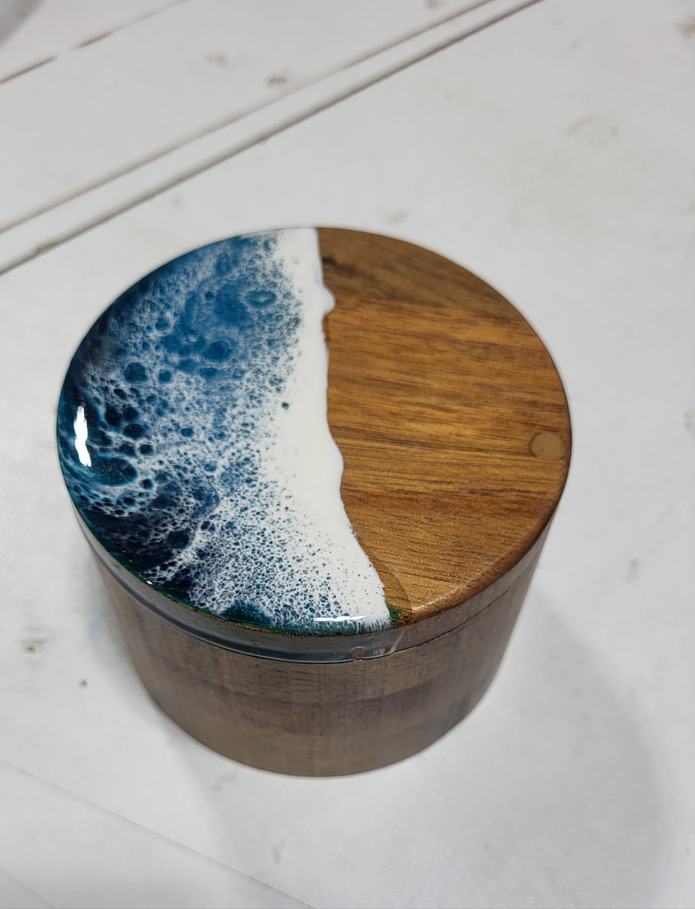 Cute hardwood Deep Container. Built in Magnet latch, so it stays shut! Topped with Nita's signature ocean.