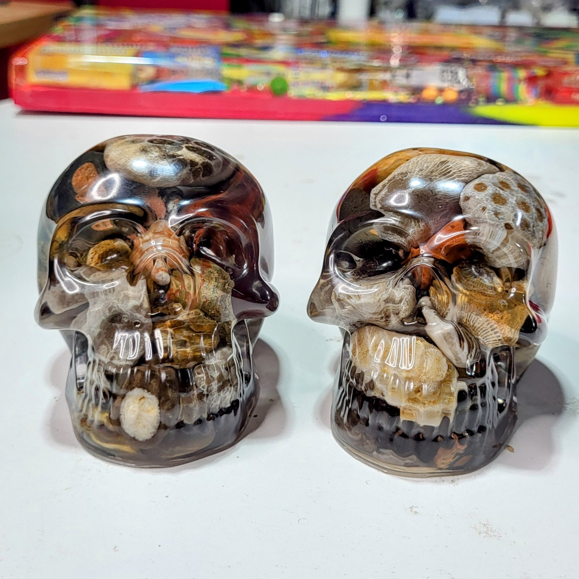 Discover the perfect blend of nature and artistry with our Petoskey Skull Resin Encapsulation. This handcrafted resin skull is infused with authentic Michigan Great Lakes stones and fossils, some including: