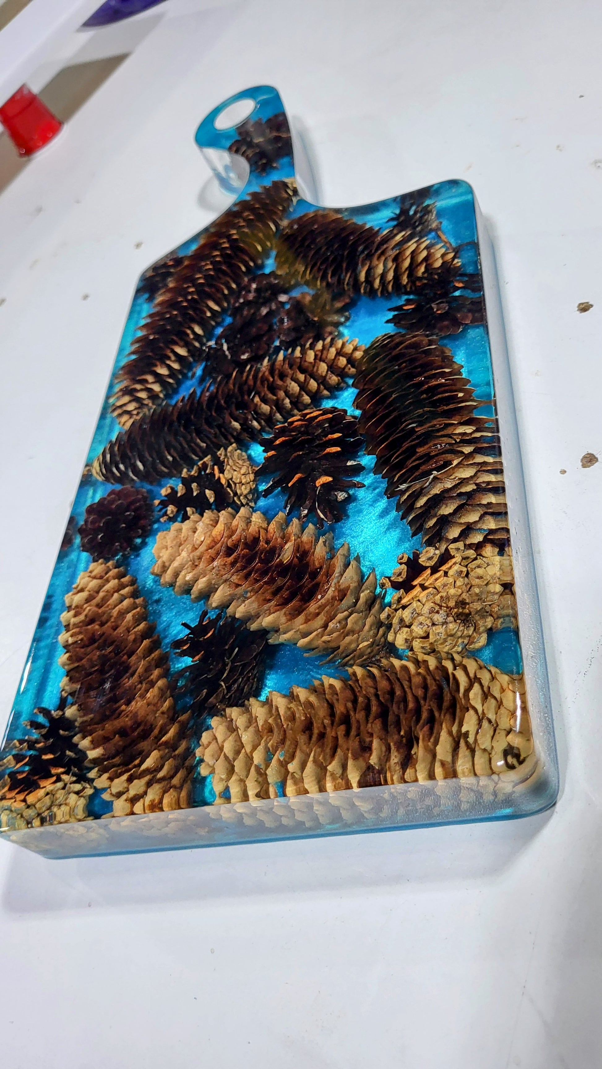 Thick gorgeous charcuterie board filled with pine cones, over Okinawa Blue pigment.  With a protective epoxy resin coating finish. Measures 17½x7" @1.5"thick.