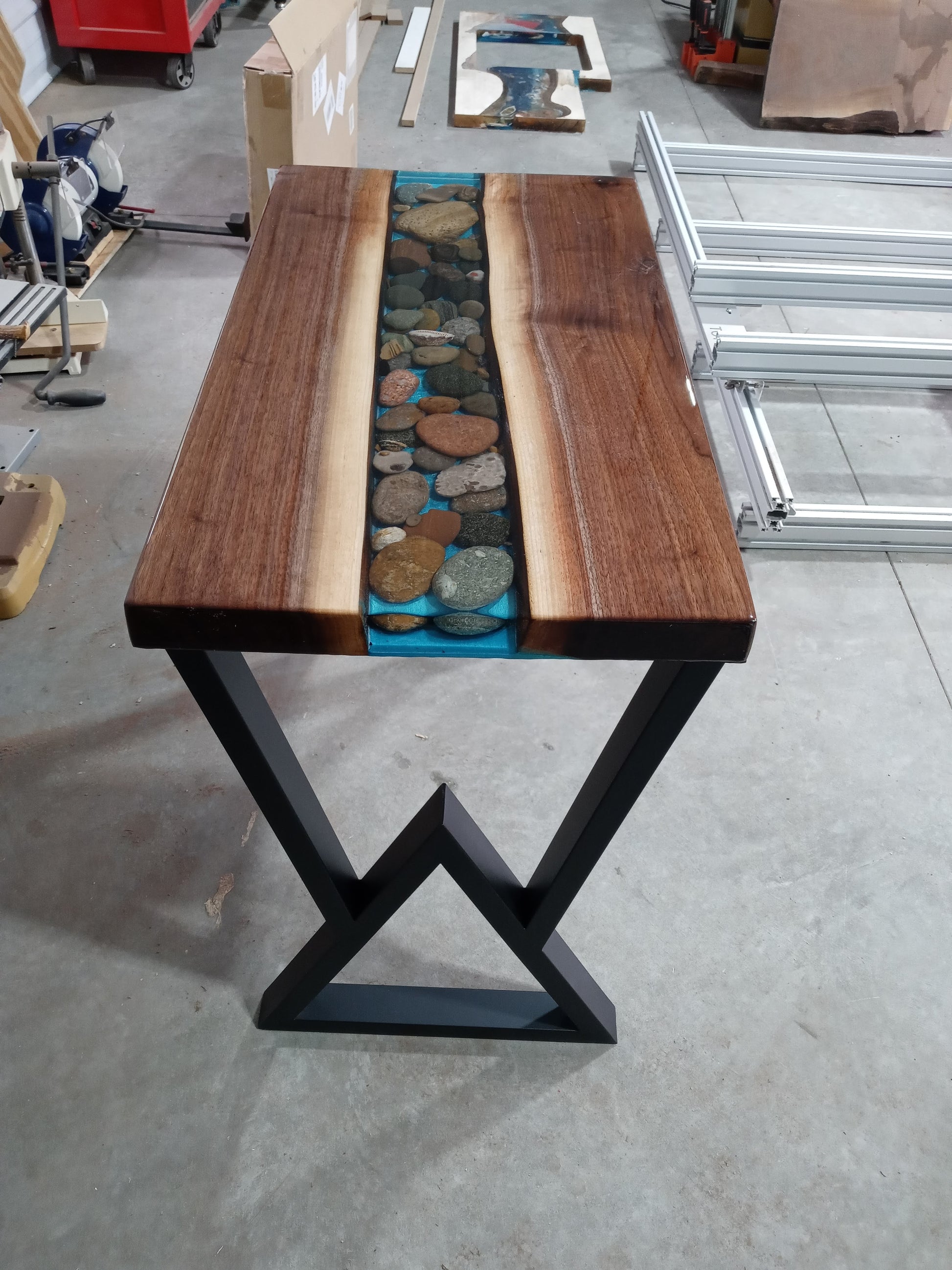 32x18. Black walnut/ river table. These legs are not attached, 16"hairpin legs will be attached by default. If you want these legs abs a message they will be added for $100.