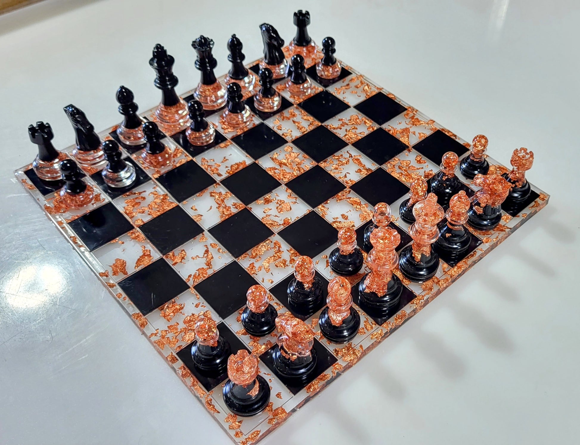 10¾x10¾ black and resin chess board,  rose gold leaf.  With  chess and checker pieces