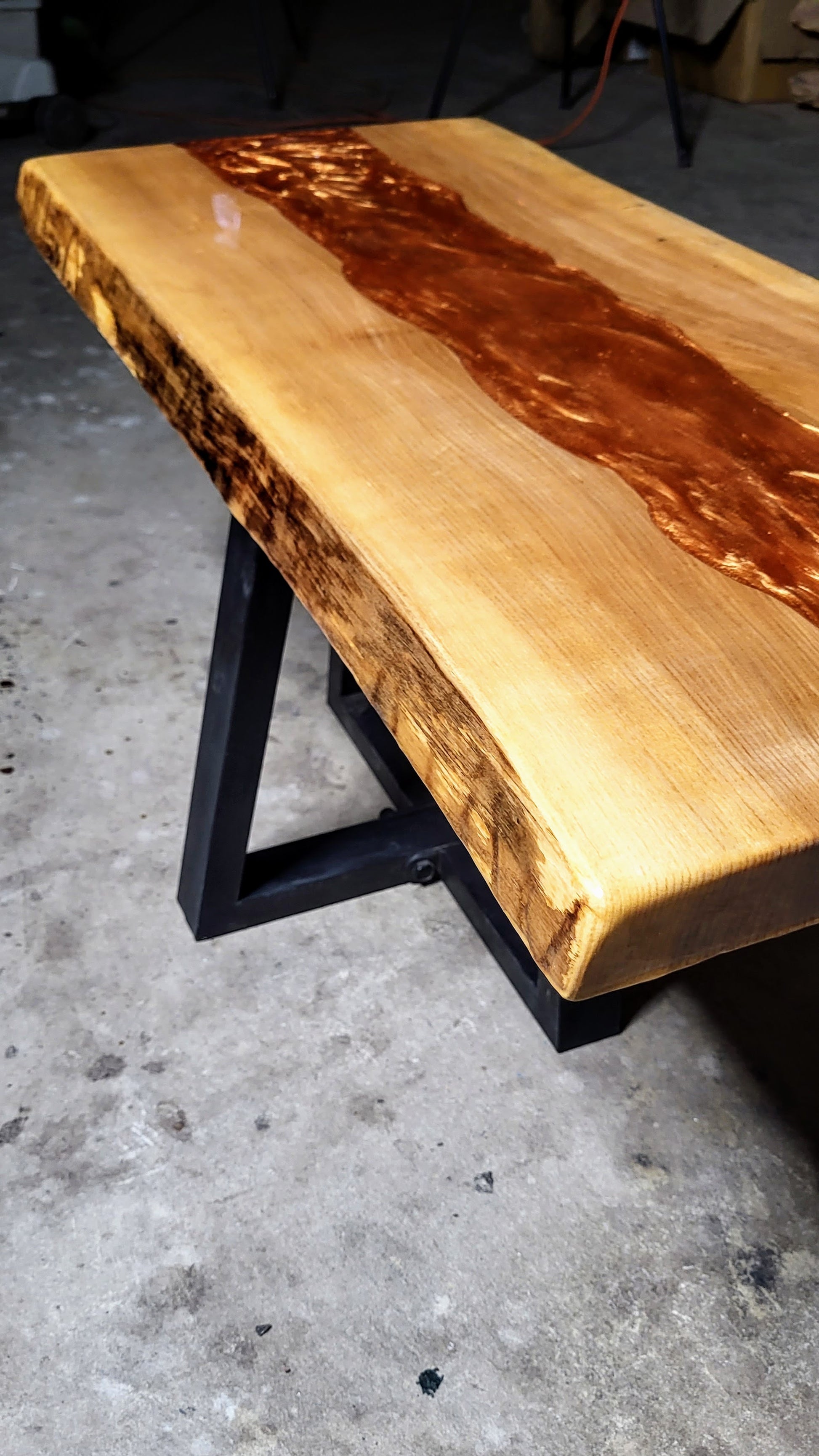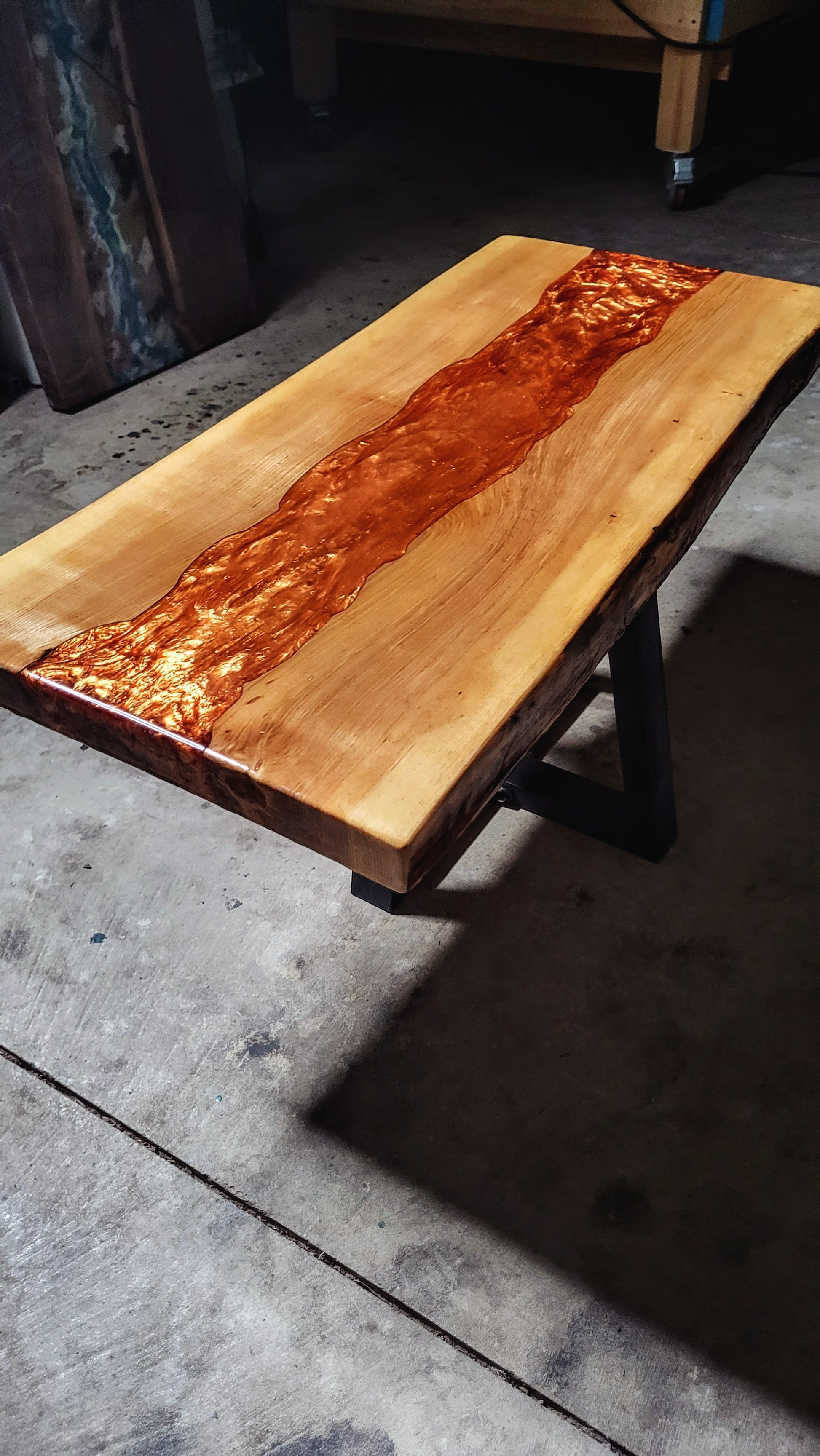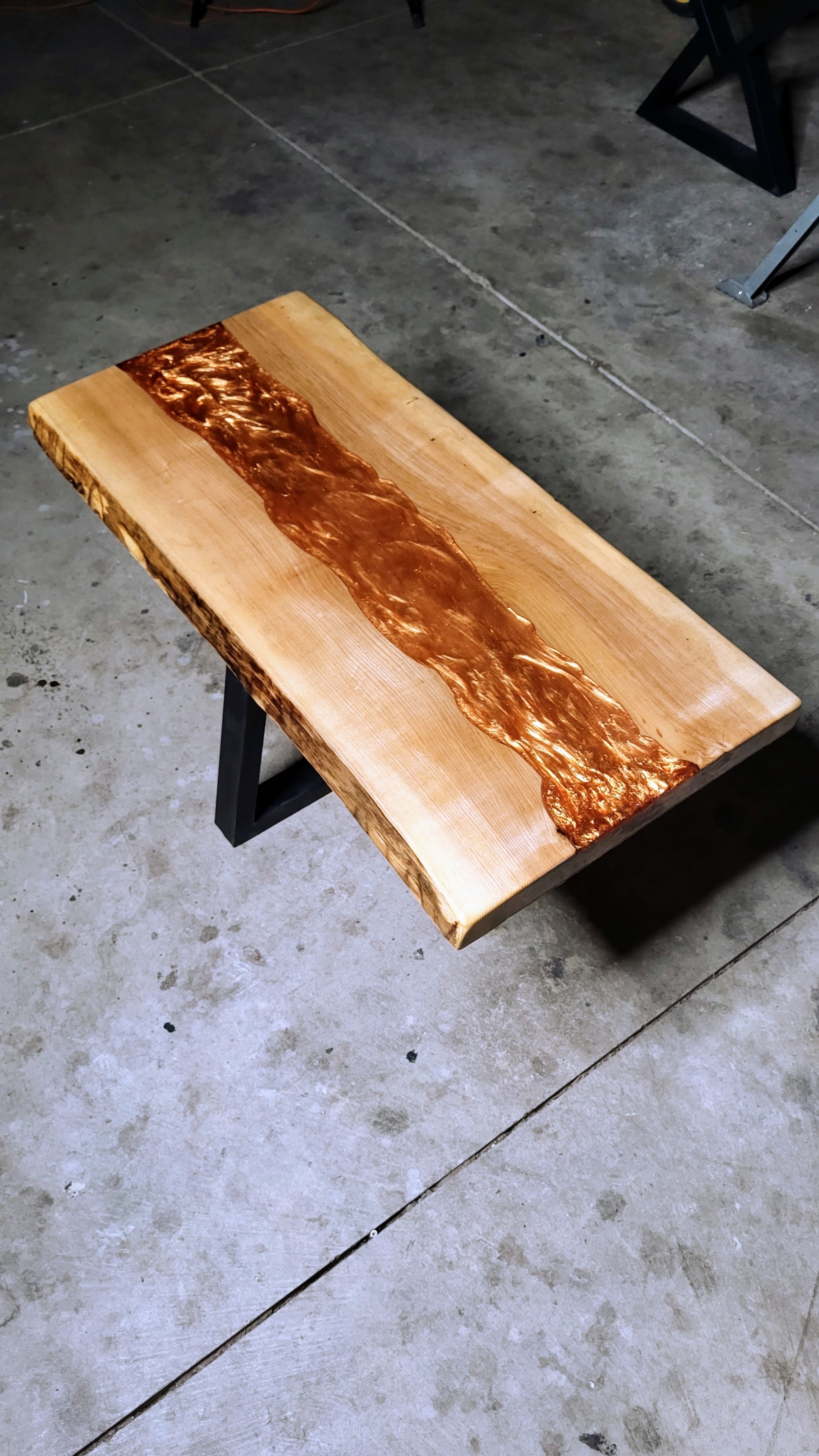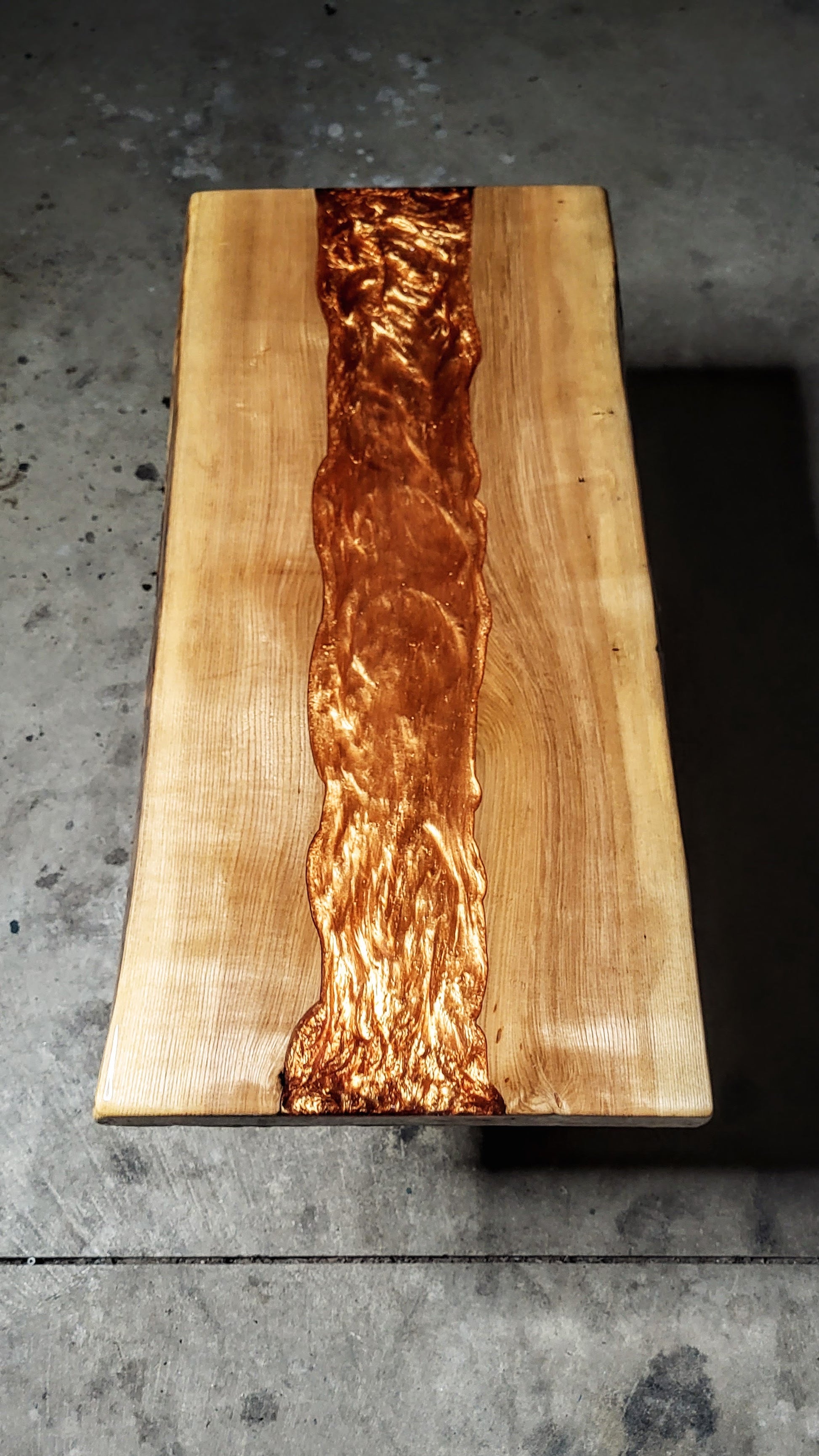 Beautiful Ash coffee table, with a copper river inlay. Epoxy resin finish. Dimensions are 34x16.5