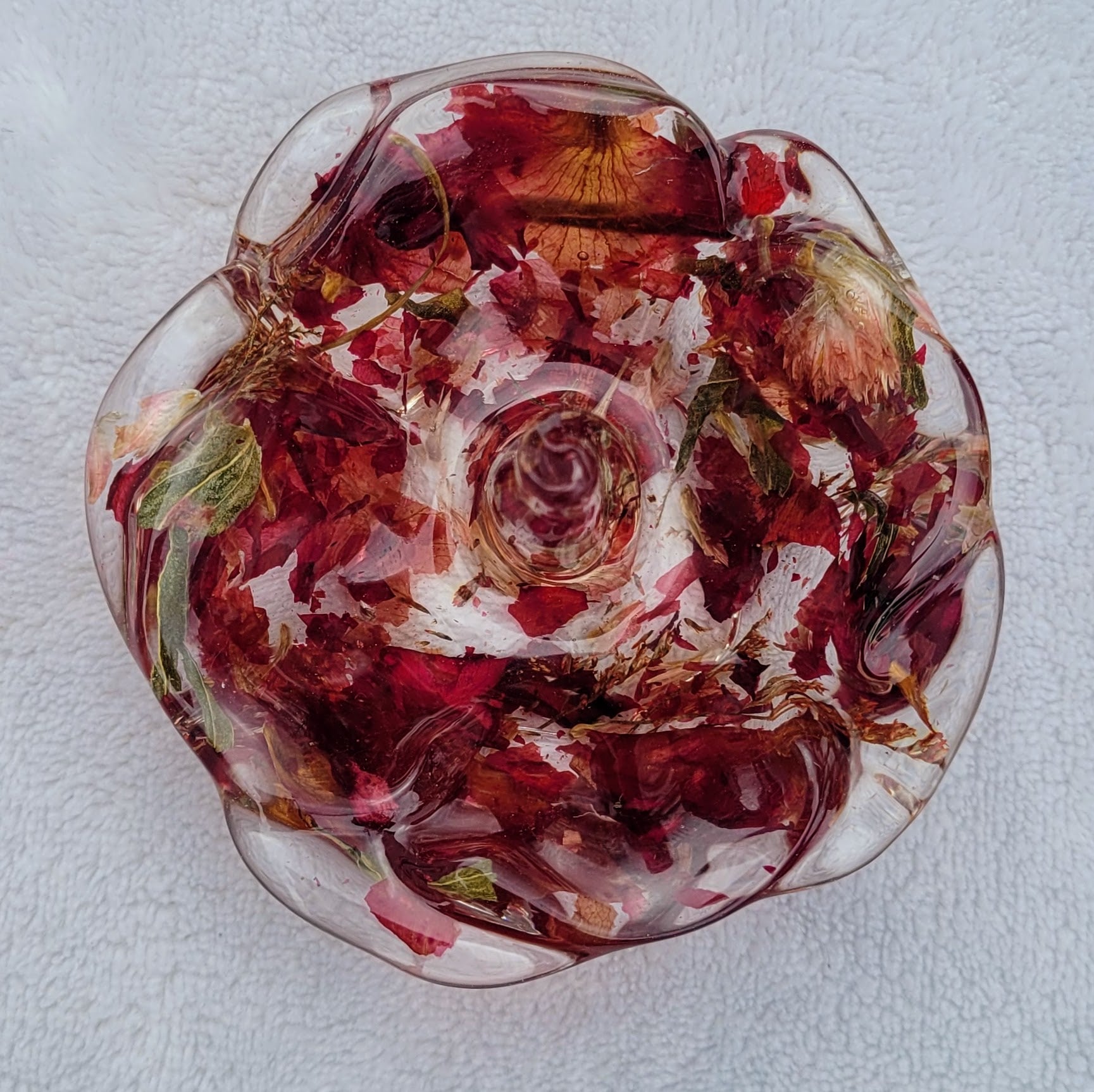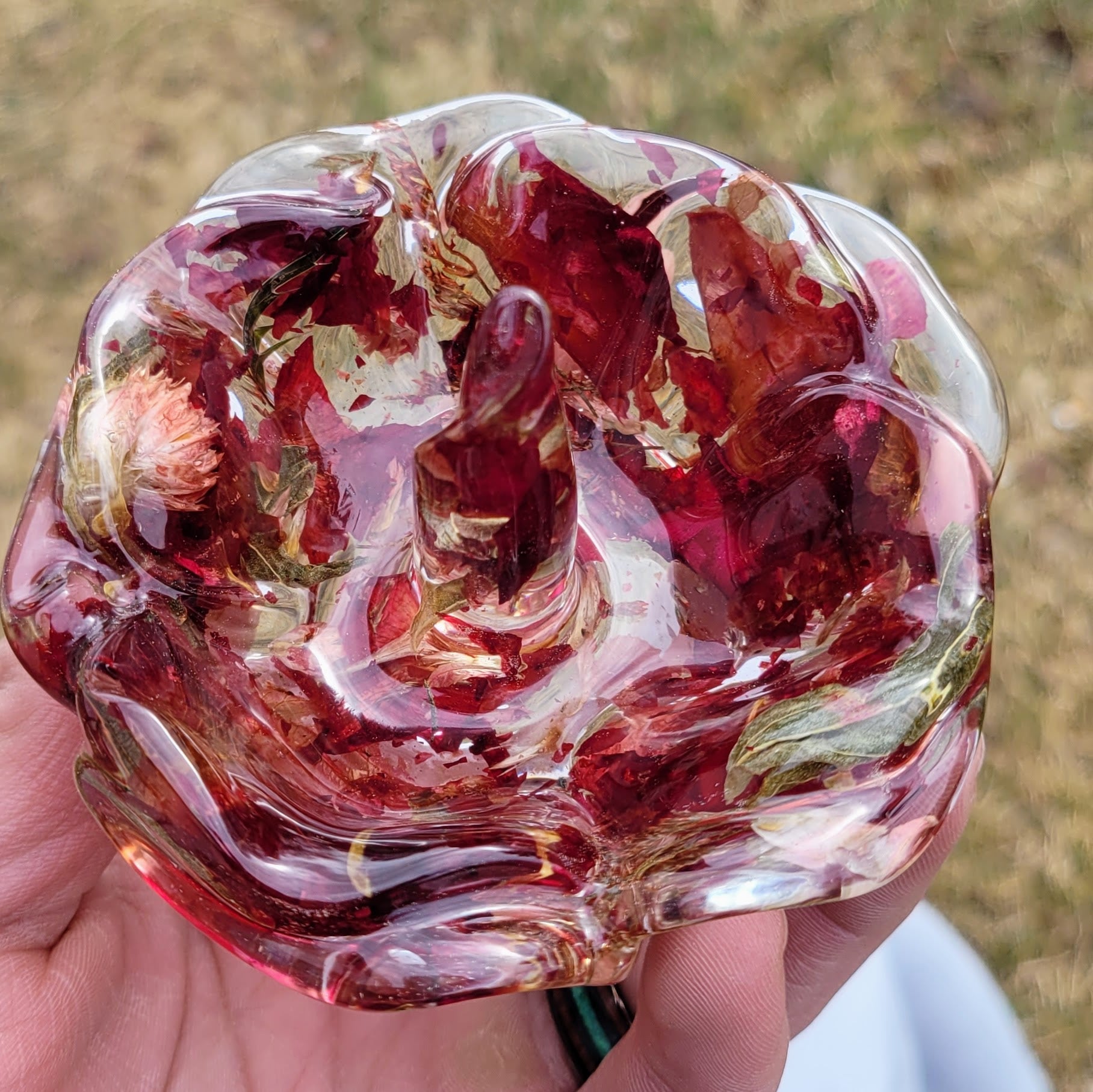Even if your flowers are wilted, tattered, or broken, they can still be beautifully preserved in crystal-clear resin. Each ring dish is uniquely crafted using your personal flowers, making it a one-of-a-kind heirloom to be treasured for generations.