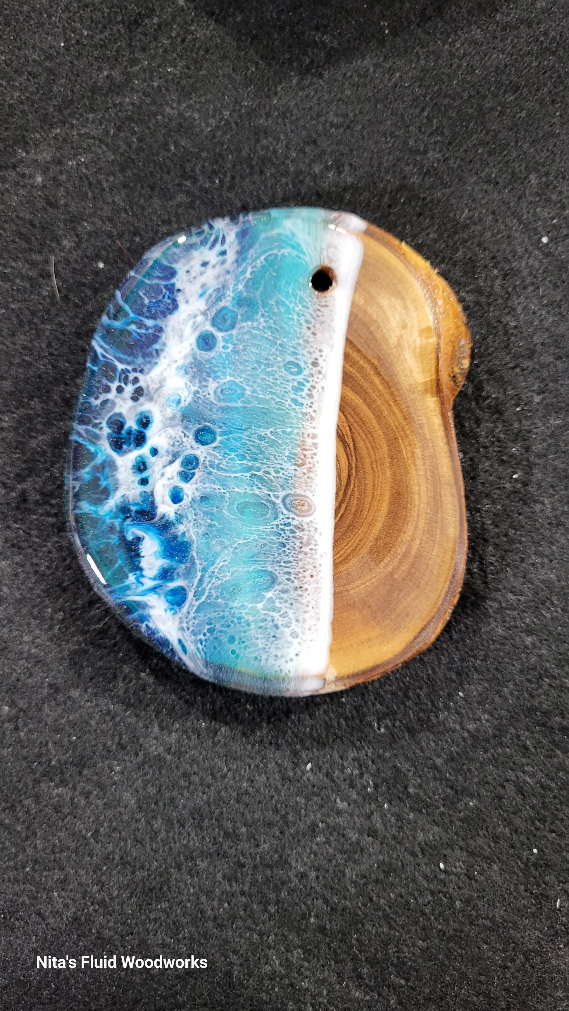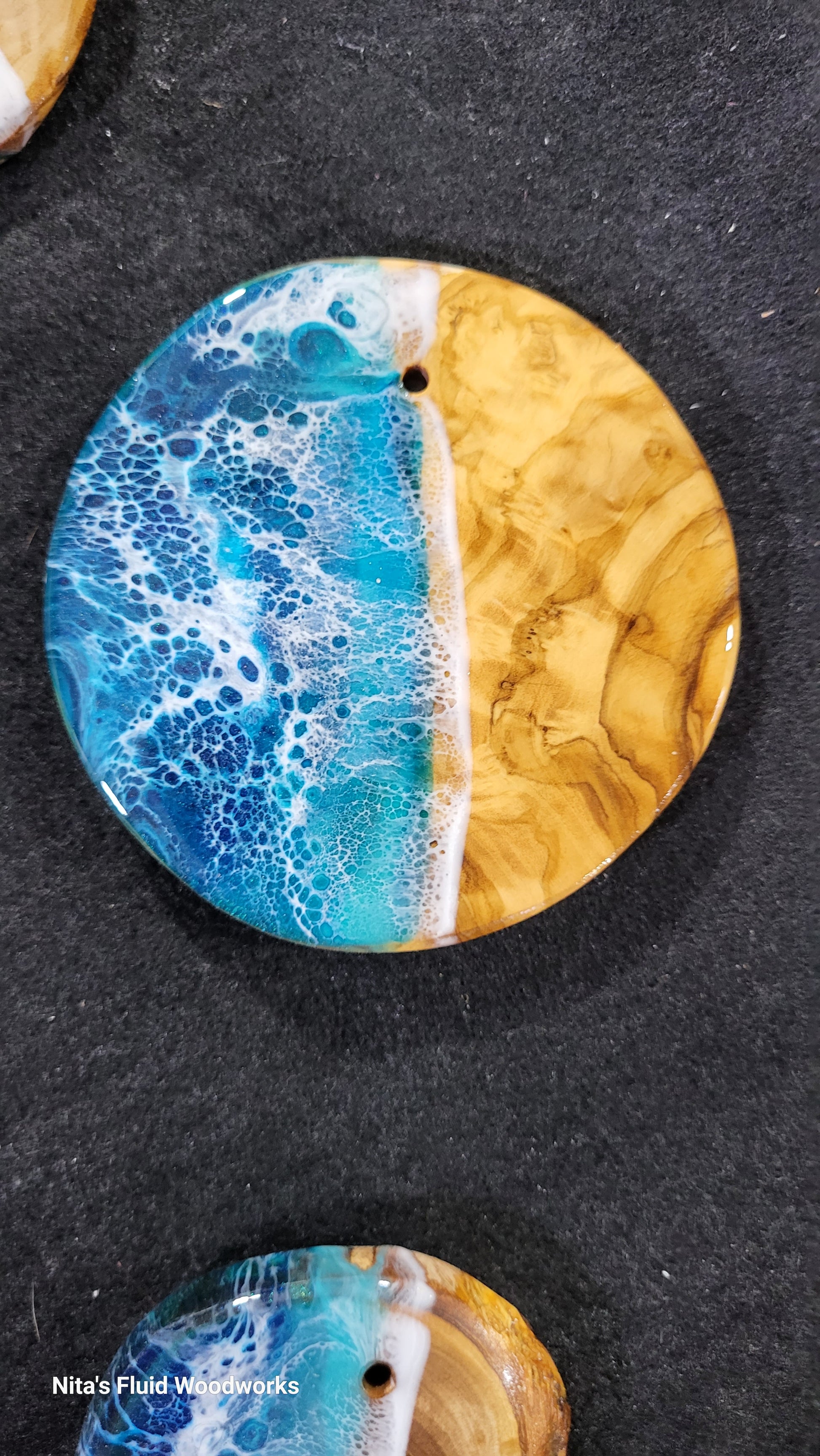Irregular shaped Olivewood slices topped with resin ocean waves. Finished with a hard oil.